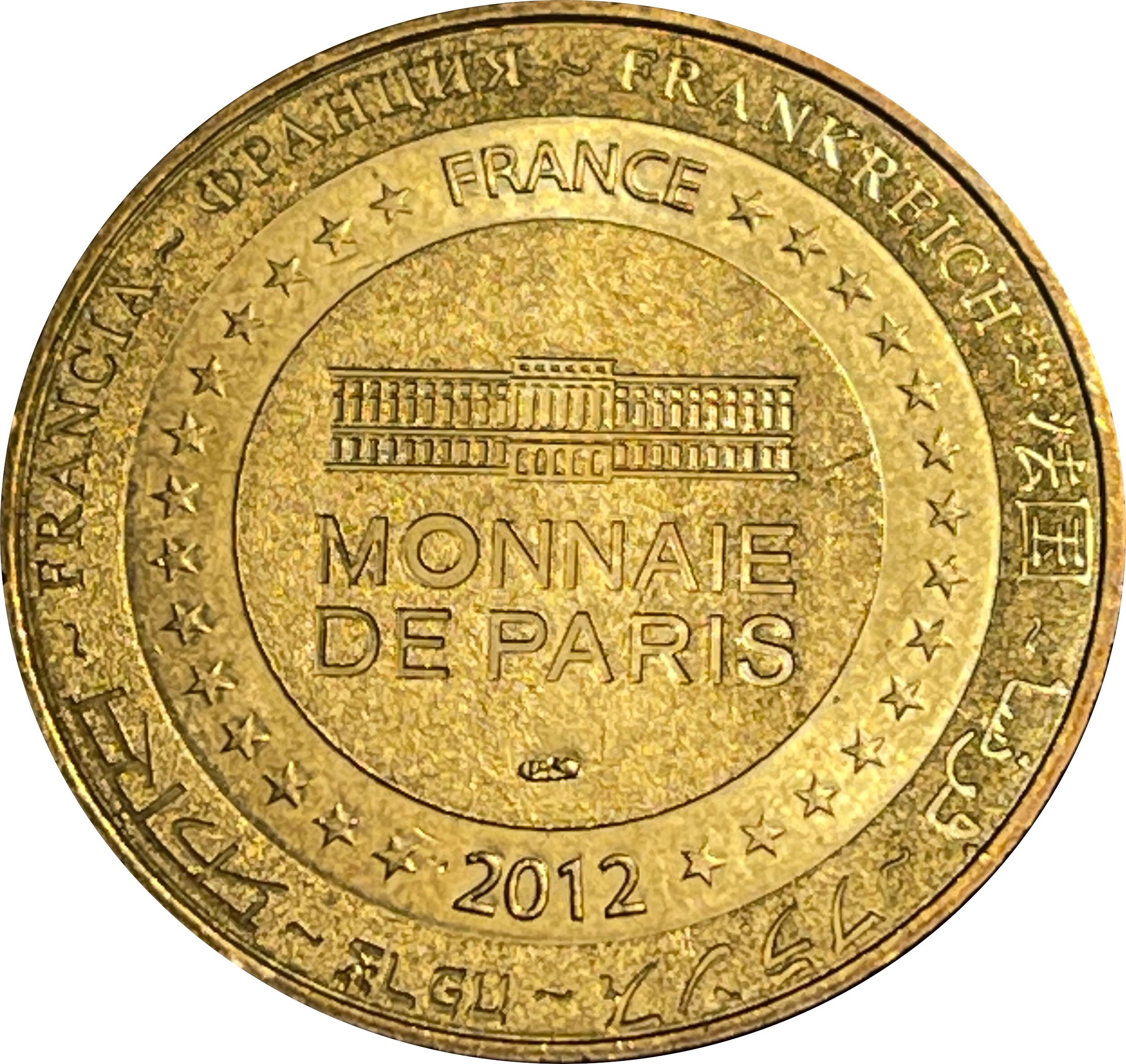 Опис: На периферії слово «Франція» написано вісьмома мовами. Франція на 12-й годині, 2012 рік на 6-й годині, все пов'язано 14 зірками праворуч і ліворуч. У центрі — будівля Monnaie de Paris.