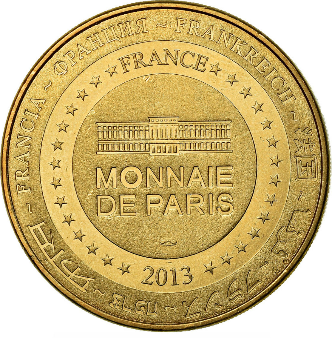 Опис: На периферії слово «Франція» написано вісьмома мовами. Франція на 12-й годині, 2013 рік на 6-й годині, все пов'язано 14 зірками праворуч і ліворуч. У центрі — будівля Моне де Парі.