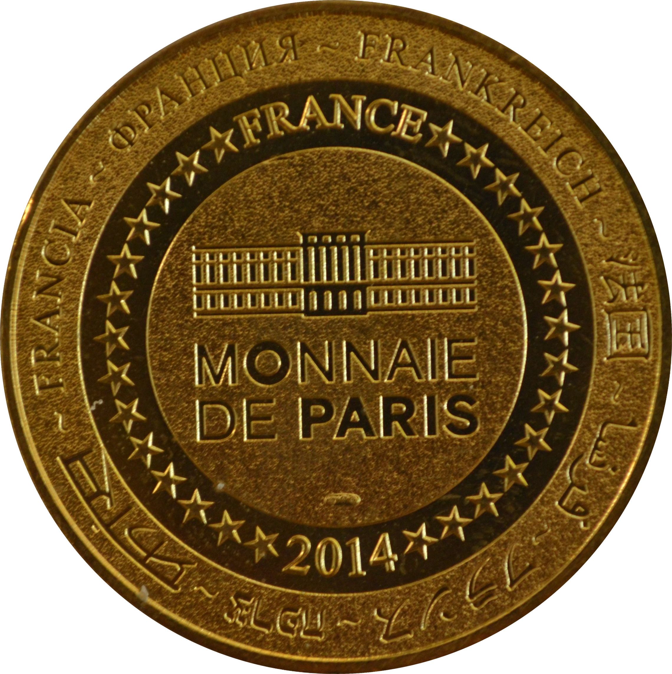 Опис: На периферії слово «Франція» написано вісьмома мовами. Франція на 12-й годині, 2014 рік на 6-й годині, все пов'язане 14 зірками праворуч і ліворуч. У центрі — будівля Monnaie de Paris. Слово «PARIS» виділено жирним шрифтом для року 2014.