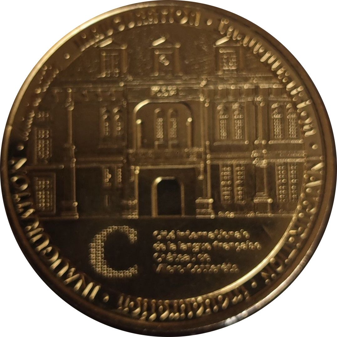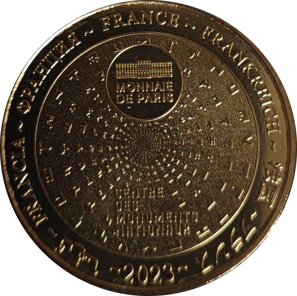 Опис: Французький текст сімома мовами по периферії. Символ Monnaie de Paris на 12-й годині. Різні піктограми Centre des Monuments Nationaux, що сходяться в центрі.