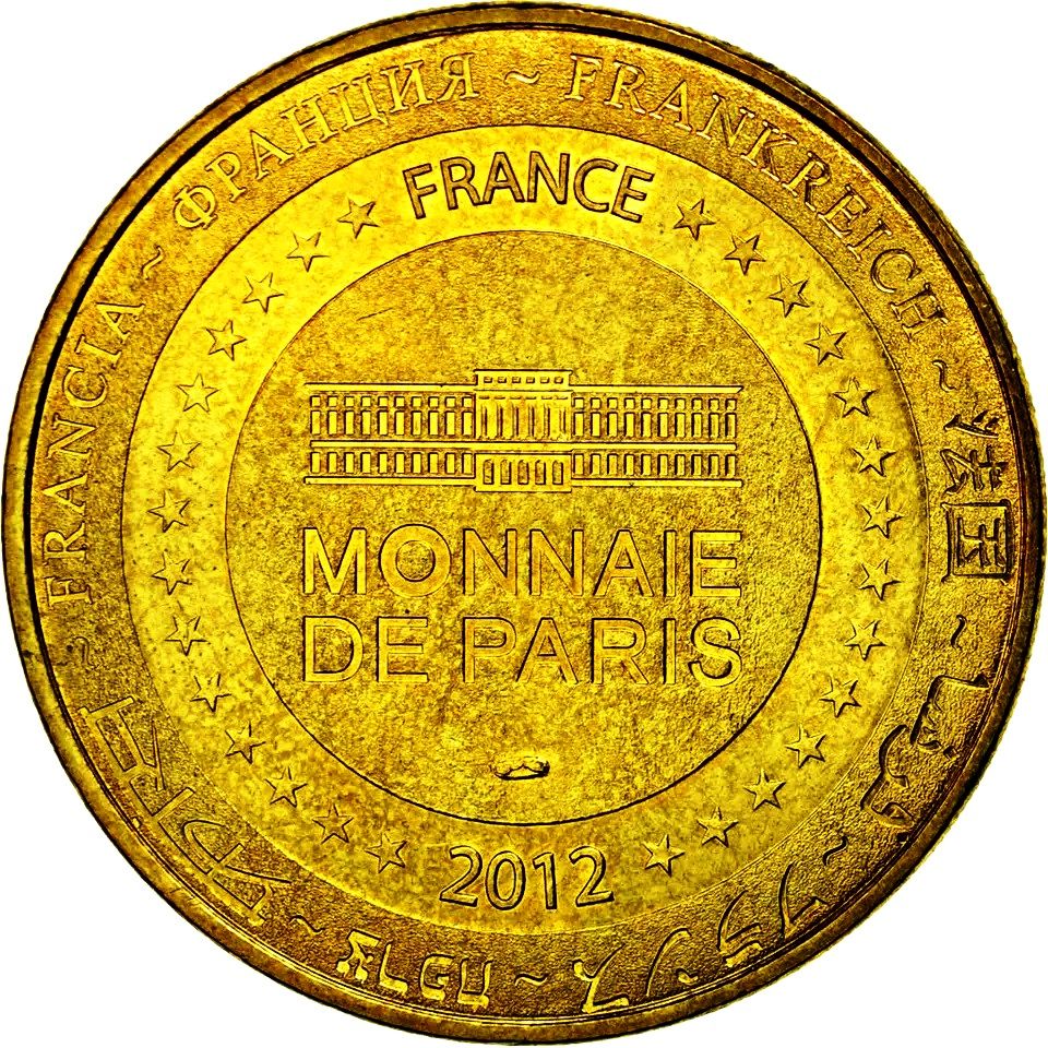 Опис: На периферії слово «Франція» написано вісьмома мовами. Франція на 12-й годині, 2012 рік на 6-й годині, все пов'язане 14 зірками праворуч і ліворуч. У центрі — будівля Монетного двору Парижа.