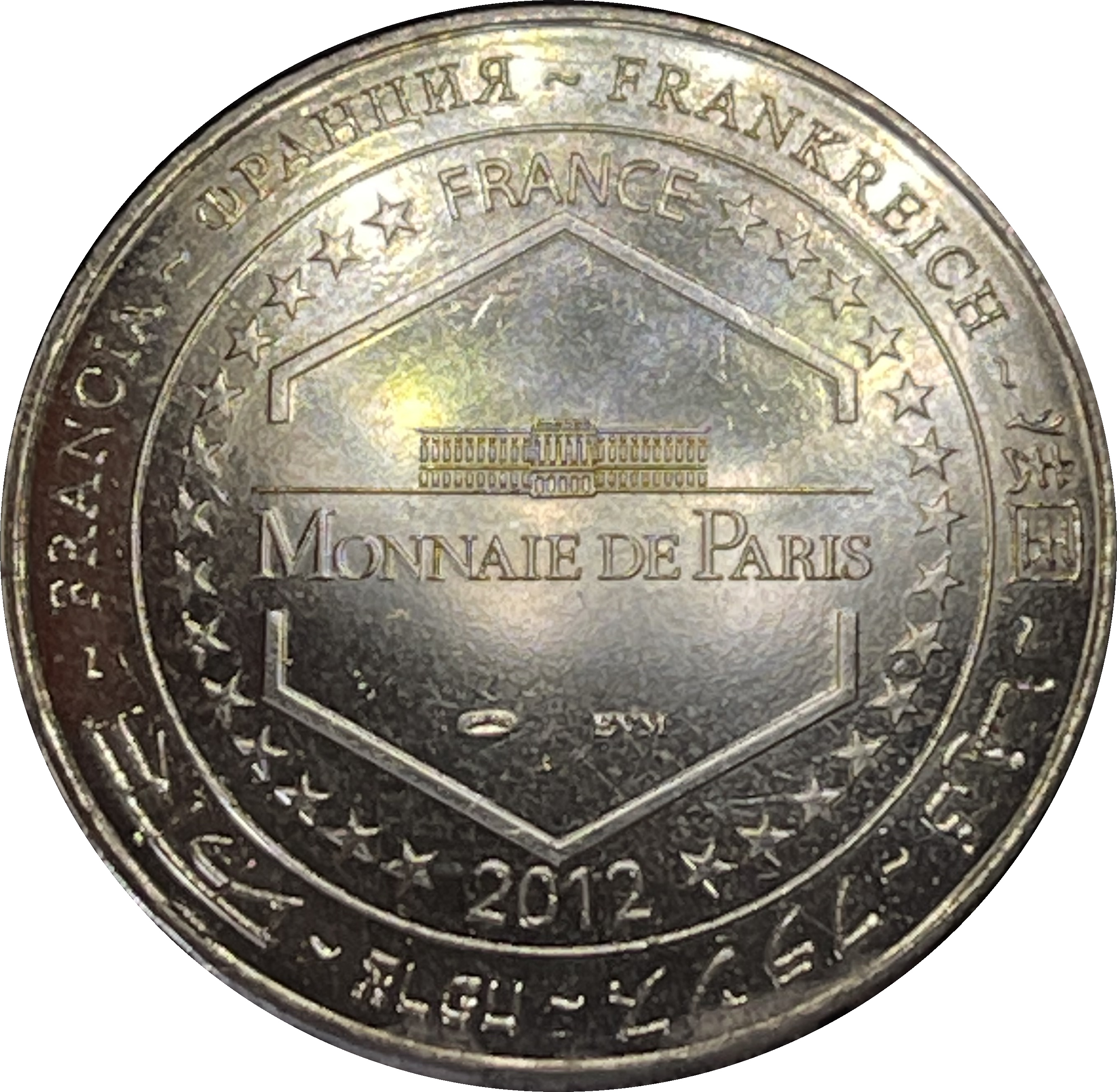 Опис: На периферії слово «Франція» написано вісьмома мовами. Франція на 12-й годині, 2012 рік на 6-й годині, все пов'язане 14 зірками праворуч і ліворуч. У центрі — будівля Monnaie de Paris у шестикутнику.