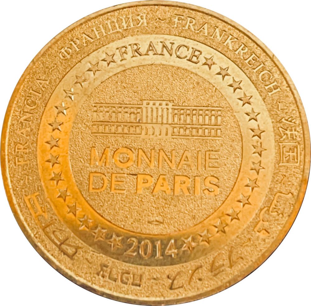 Опис: На периферії слово «Франція» написано вісьмома мовами. Франція на 12-й годині, 2014 рік на 6-й годині, все пов'язане 14 зірками праворуч і ліворуч. У центрі — будівля Моне де Парі.