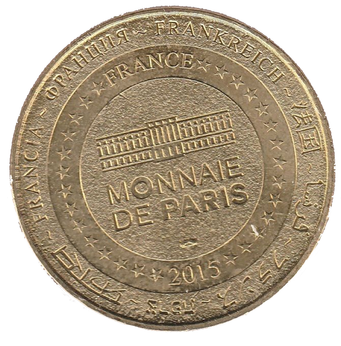Опис: На периферії слово «Франція» написано вісьмома мовами. Франція на 12-й годині, 2015 рік на 6-й годині, все пов'язане 14 зірками праворуч і ліворуч. У центрі — будівля Моне-де-Парі.