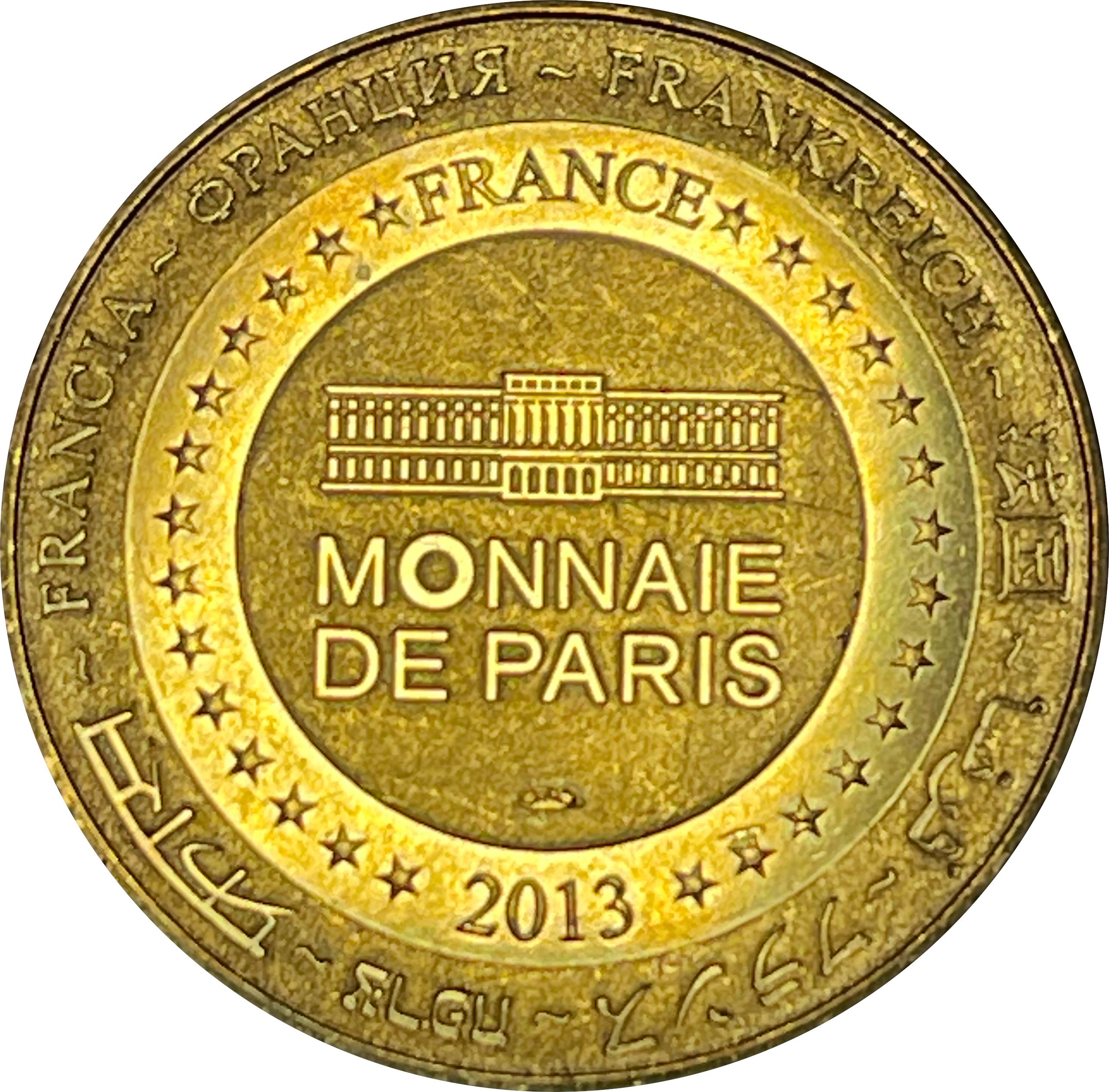 Опис: На периферії слово «Франція» написано вісьмома мовами. Франція на 12-й годині, 2013 рік на 6-й годині, все пов'язано 14 зірками праворуч і ліворуч. У центрі — будівля Моне де Парі.