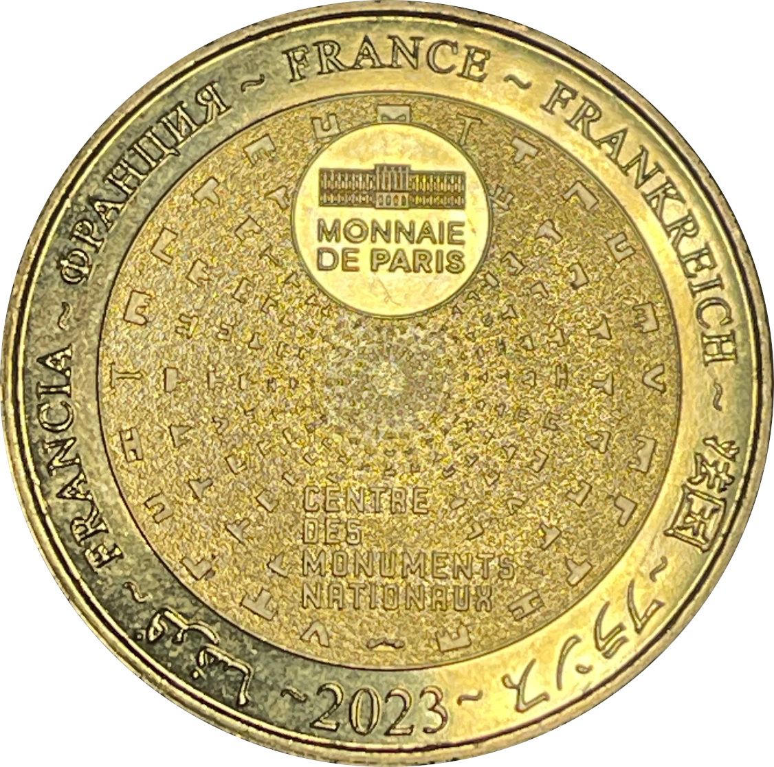 Опис: На периферії слово «Франція» написано сімома мовами. У положенні «12 годин» зображено будівлю Monnaie de Paris у колі. Піктограми Centre des Monuments Nationaux сходяться в центрі.