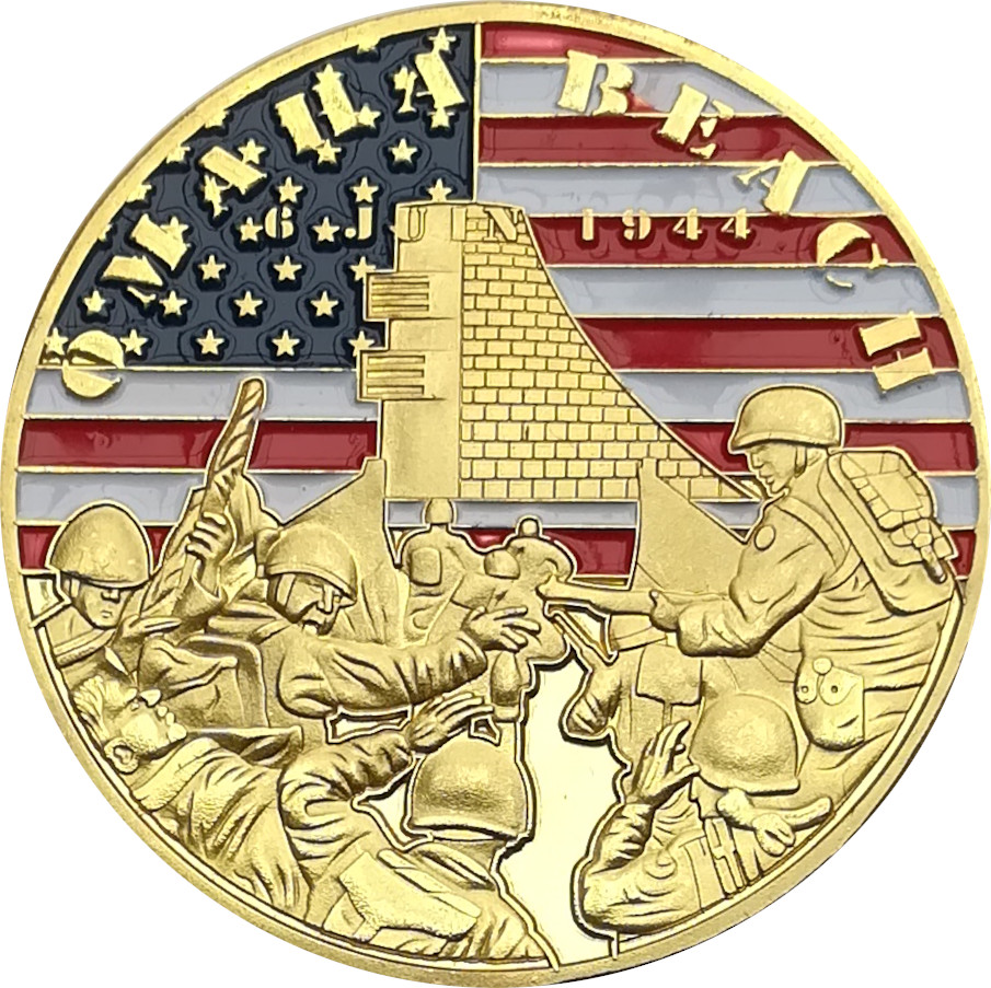 Опис: На тлі американського прапора кілька солдатів союзників висаджуються на пляжі Омаха.