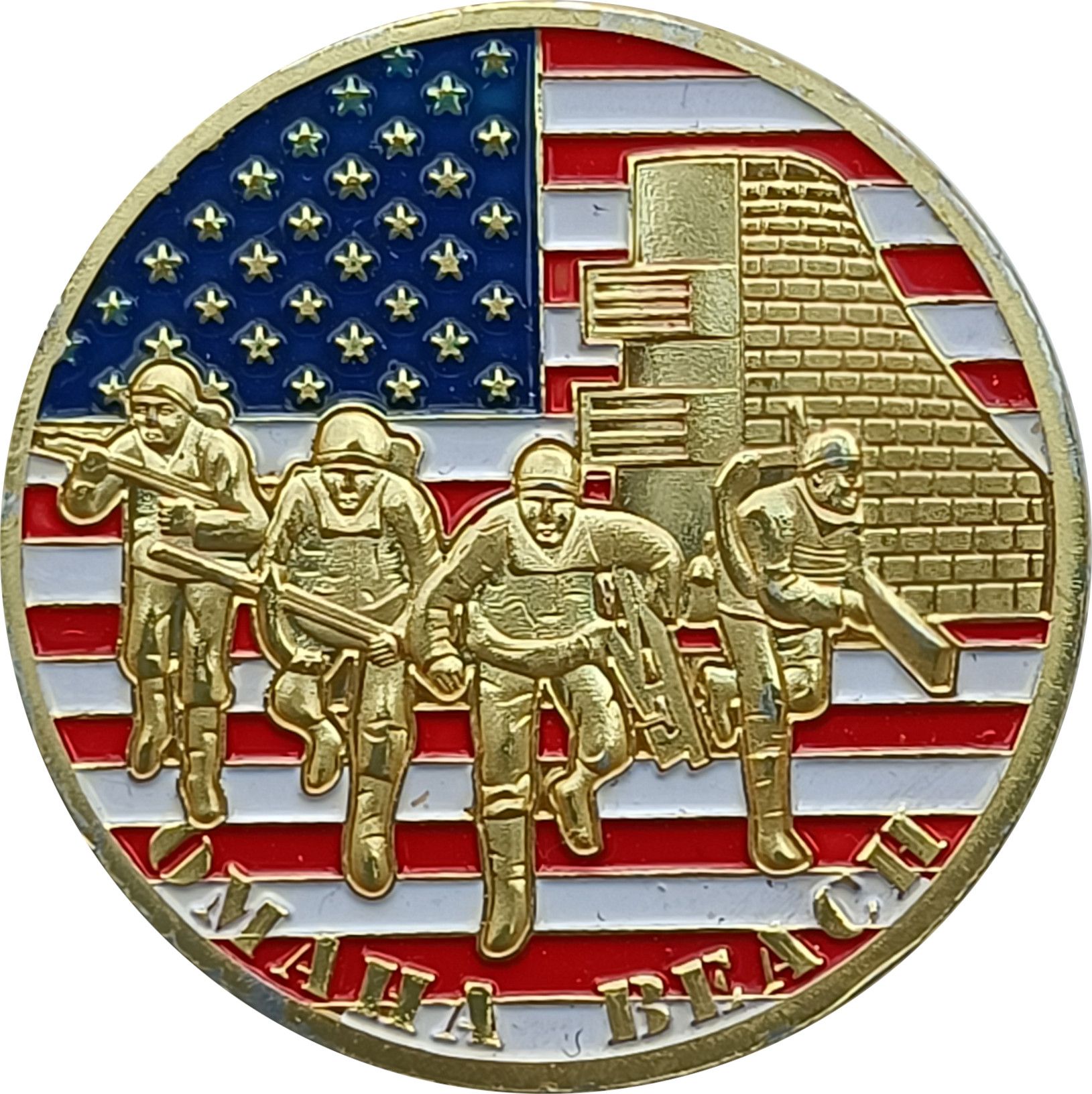 Опис: На тлі зображено американський прапор. Американські солдати висаджуються з баржі на пляжі Нормандії «Омаха-Біч».