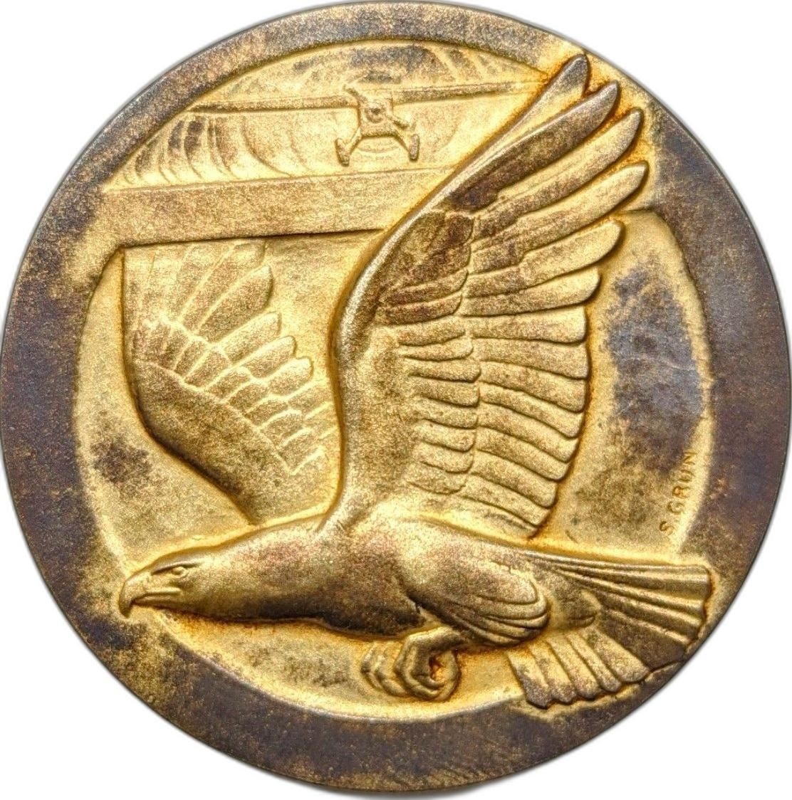 Опис: Орел, що летить ліворуч, займає більшу частину медалі, а зверху над ним зображено невеликий моноплан.