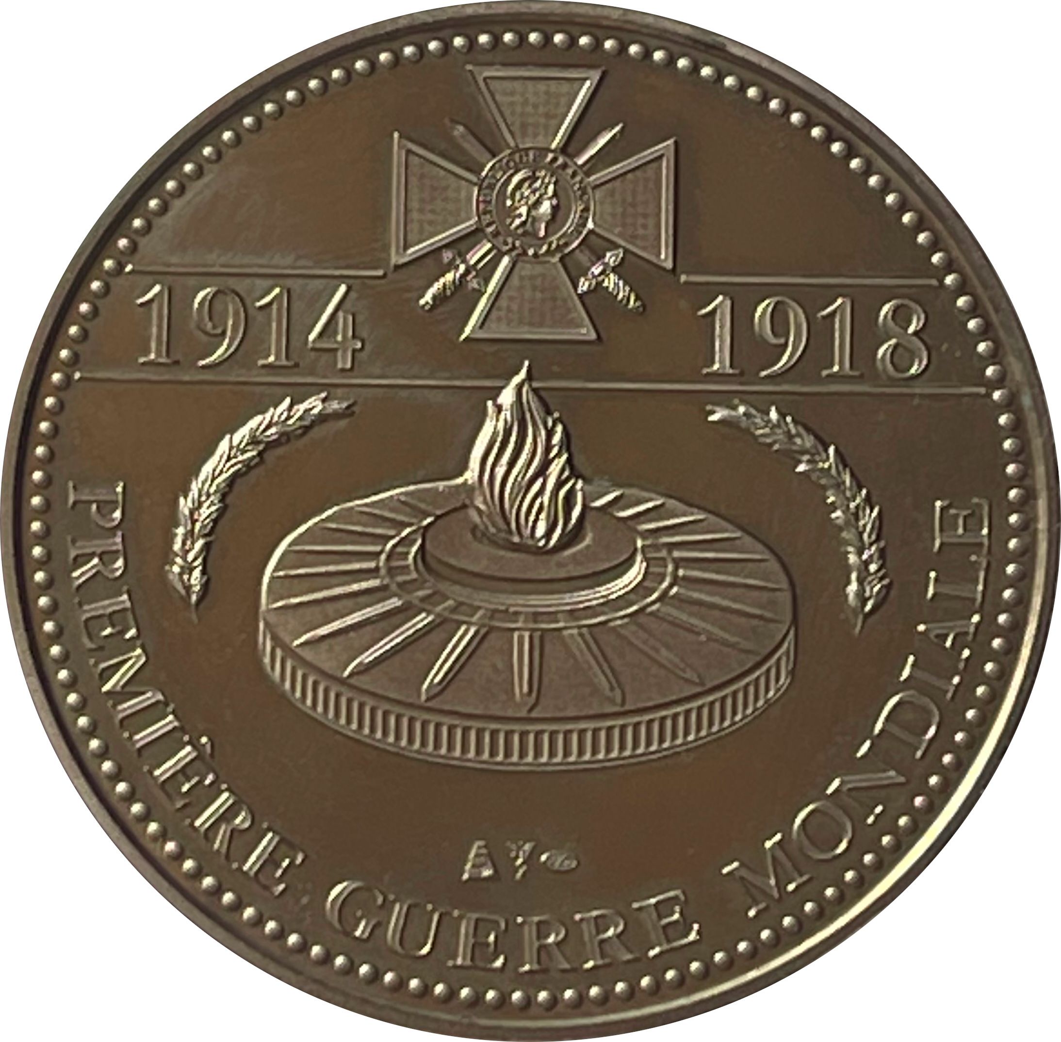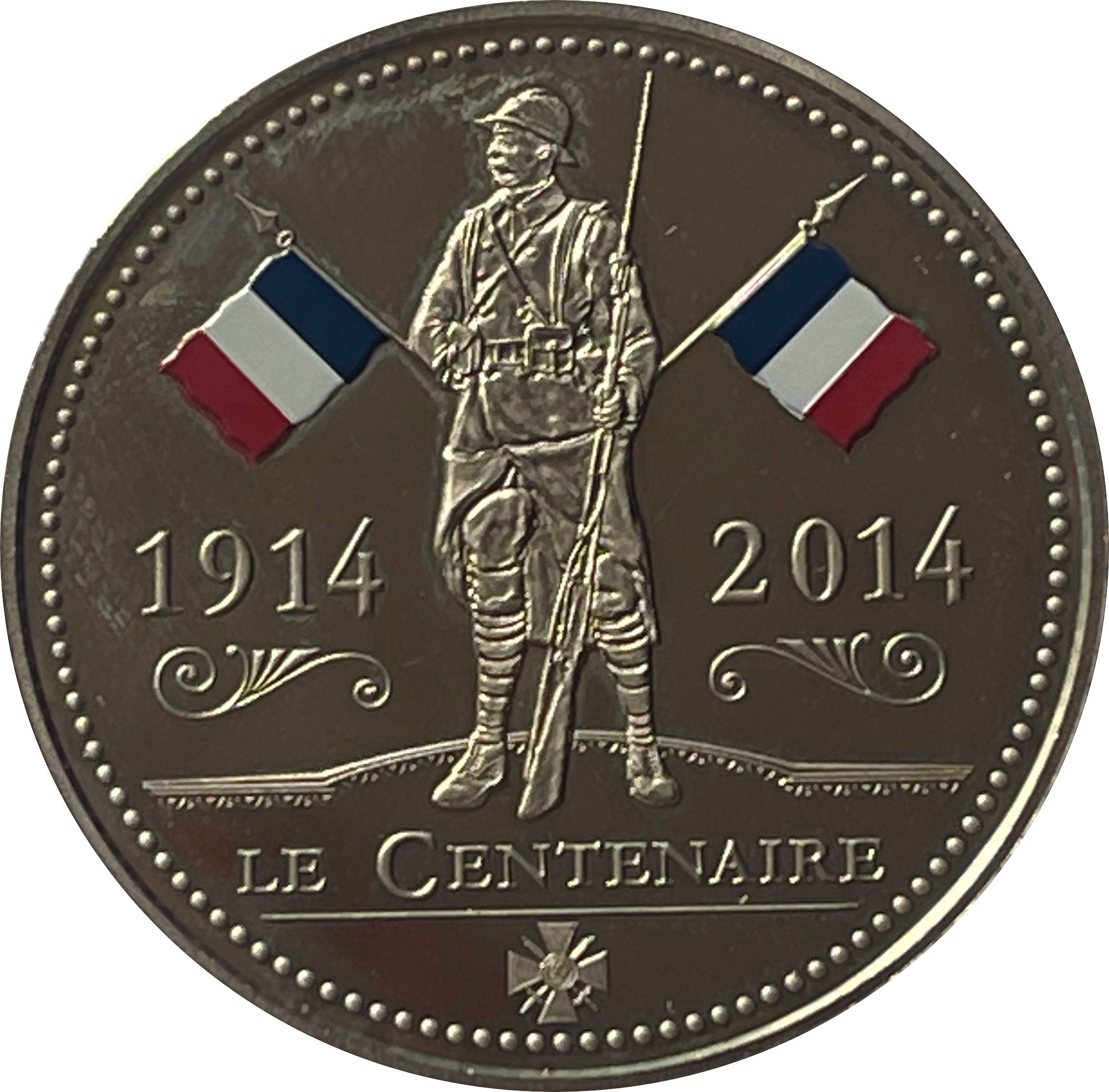 Опис: Солдат, що стоїть обличчям ліворуч. Він тримає гвинтівку з багнетом. За ним два кольорові французькі прапори. У нижній частині — аверс Croix de Guerre 1914-1918. Коло з крапок утворює сувій.