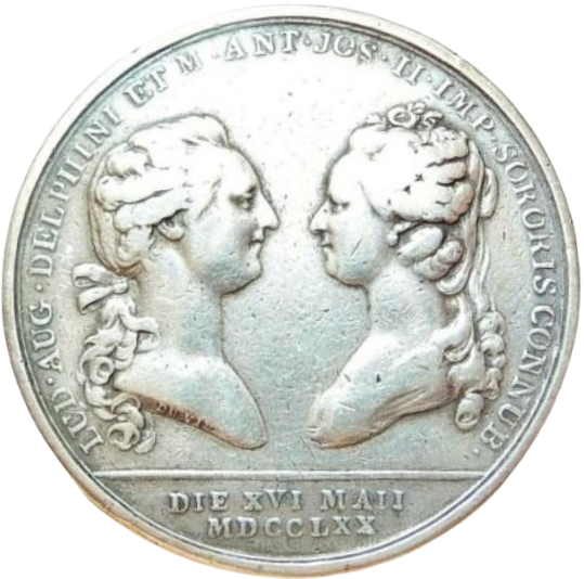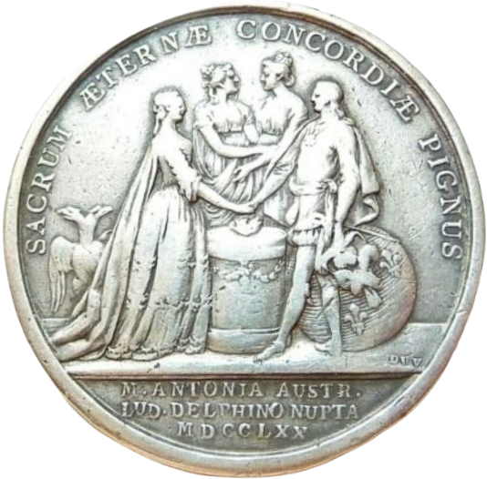 Опис: На аверсі зображені бюсти дофіна та Марії-Антуанетти. Надпис зверху, дата в ексергу. На бюсті дофіна напис «DUVIV».