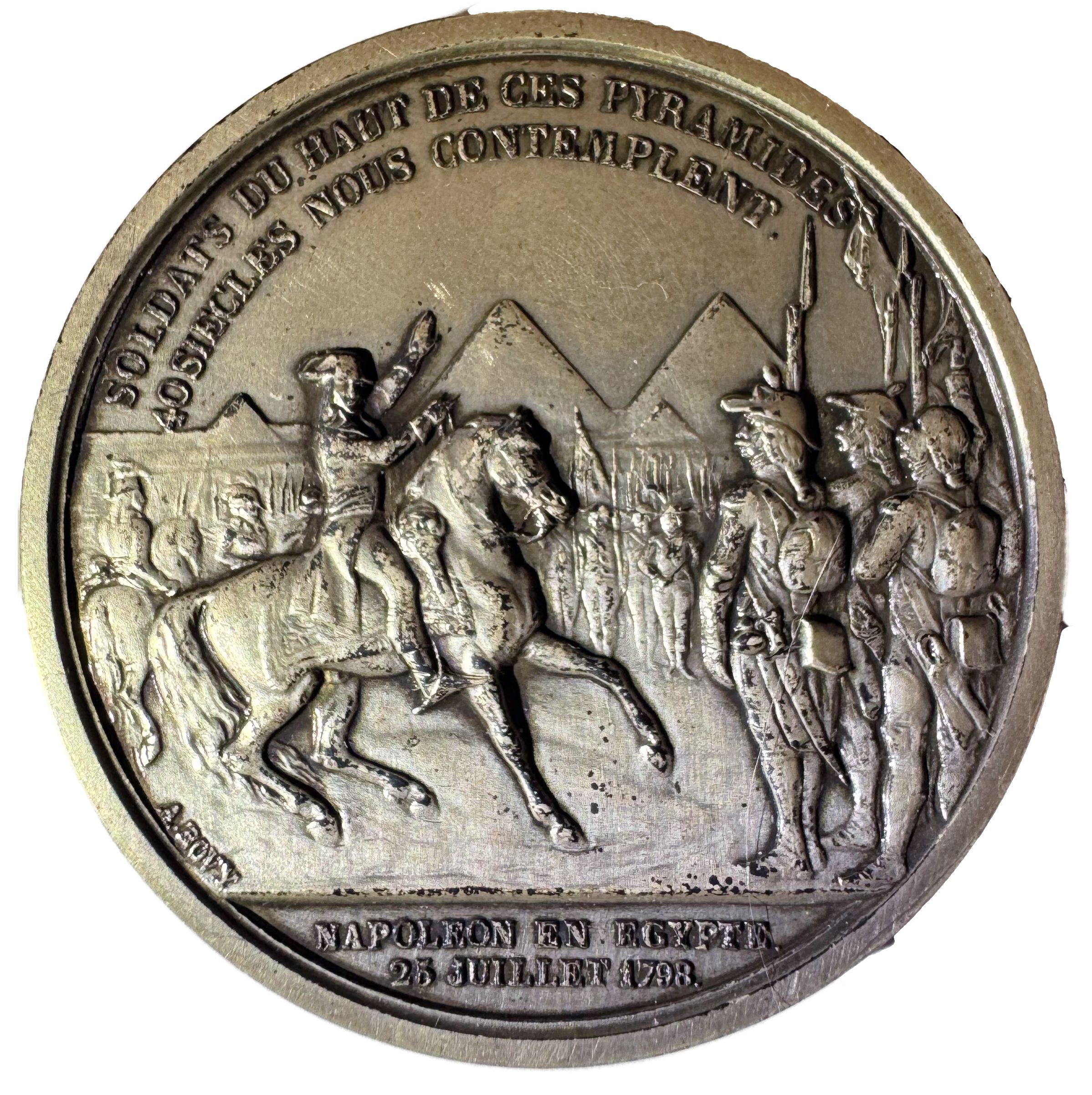 Опис: Військова сцена з Бонапартом на коні ліворуч, який піднімає праву руку. Єгипетські піраміди на задньому плані. Солдати вишикувалися праворуч, тримаючи рушниці.