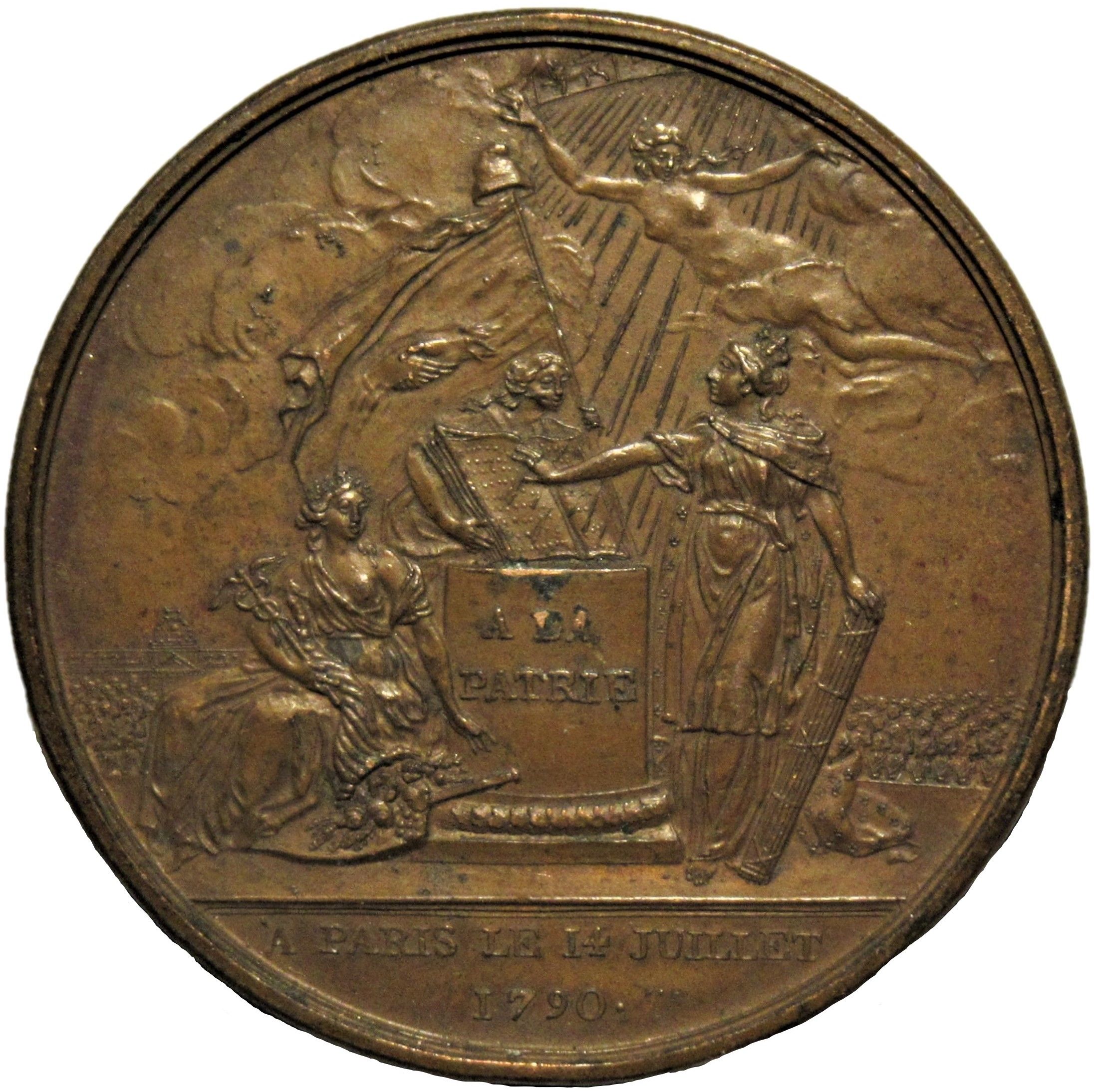 Опис: Франція у вигляді коронованої жінки, яка тримає лікторський жезл біля своїх ніг і присягає на Конституції, розміщеній на вівтарі з написом. За вівтарем — Свобода, що тримає прапор, увінчаний фригійським капелюхом; ліворуч від вівтаря — Фелісіті, що сидить ліворуч, тримаючи крилатий кадуцей, а поруч із нею — ріг достатку. У повітрі Істина розганяє темряву помилок і спрямовує своє світло на книгу Конституції. Позаду — натовп на Марсовому полі. Напис на ексергу з датою.