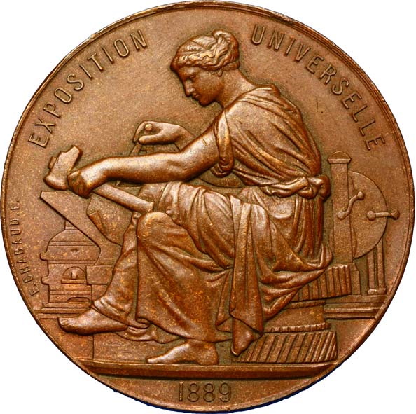 Опис: Алегорія промисловості, що обробляє метал, сидячи на шестернях.