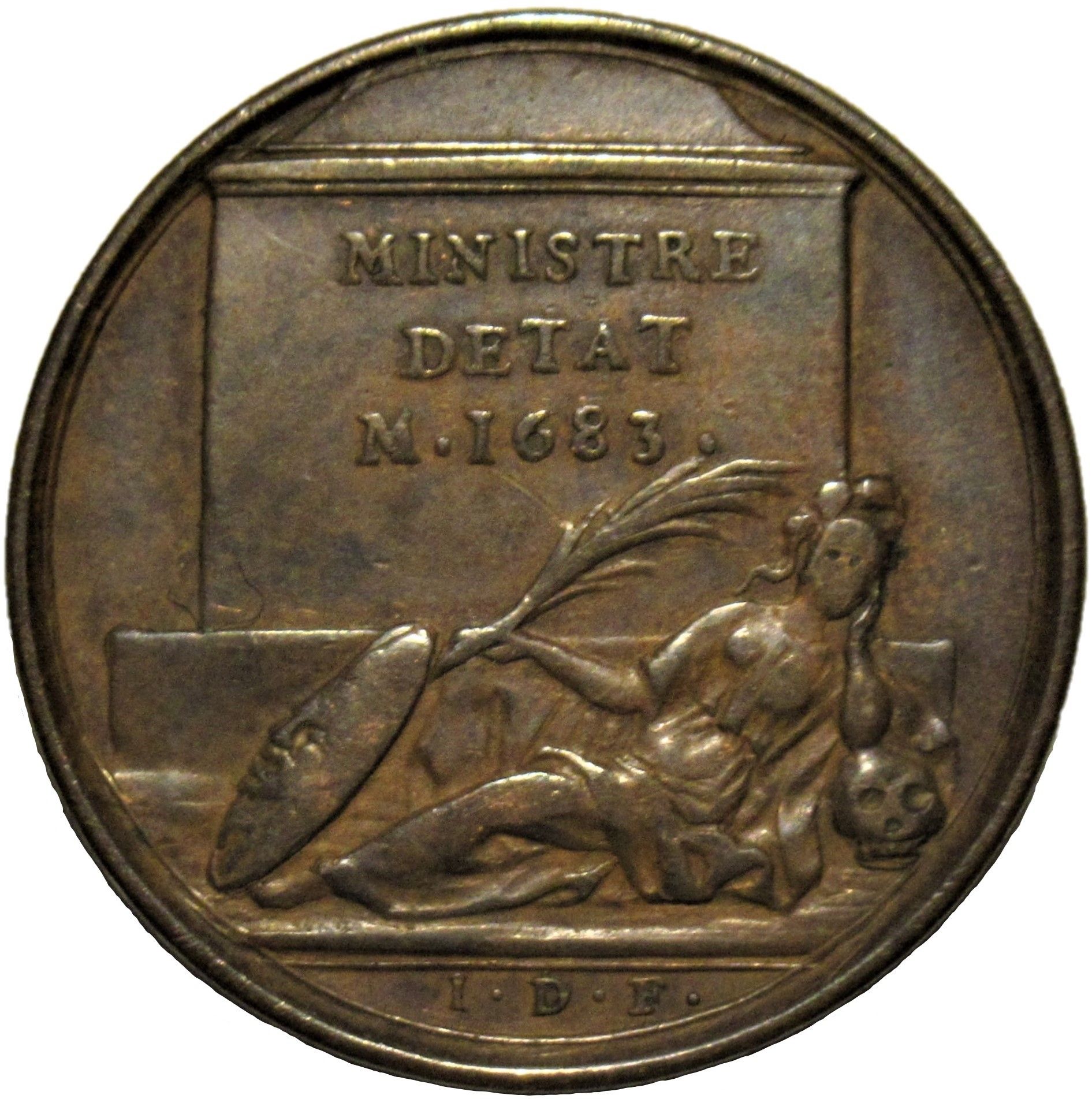 Опис: Напис у чотирьох рядках на його могилі, посада та дата смерті Кольбера. Лежача Мінерва, що тримає пальму, біля її ніг щит із головою Горгони, що спирається на череп. У нижній частині — ініціали гравера.