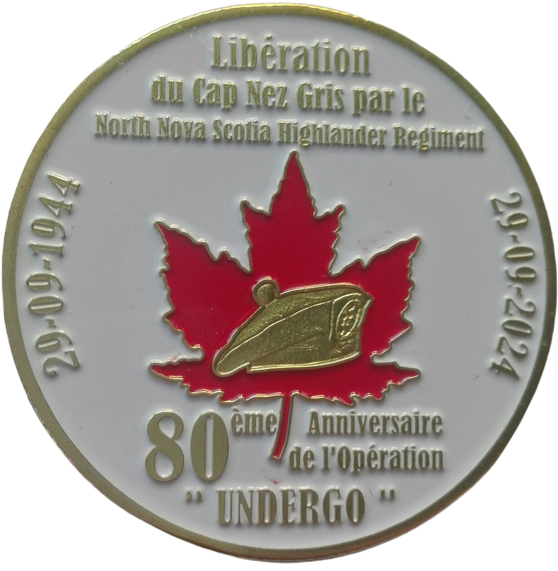 Опис: Золотий берет на червоному кленовому листі в центрі. Напис у 8 золотих рядках на білому тлі.