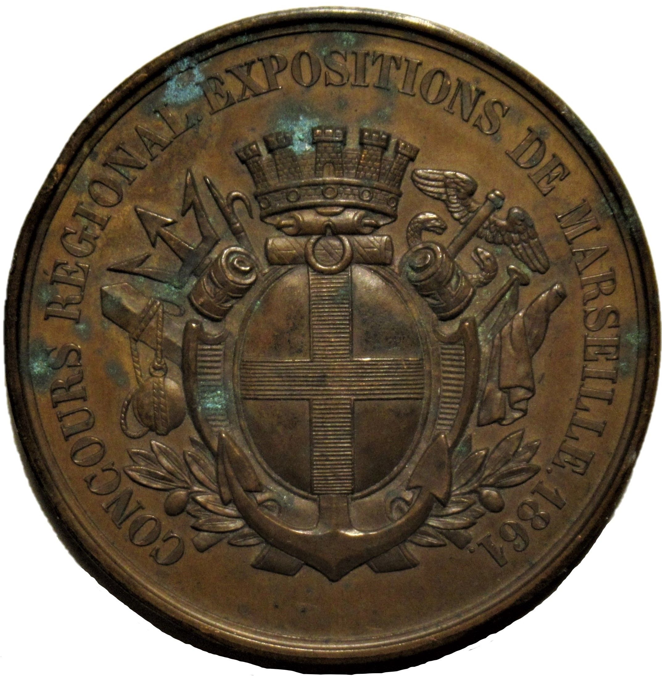 Опис: Щит міста Марселя, обрамлений гілками оливкового дерева, тризубом, кадуцеєм, прапором та щоглою човна. Навколо — напис із датою.
