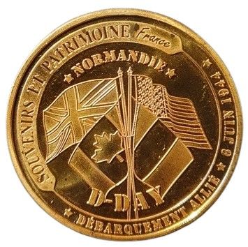 Опис: Солдати висаджуються на пляжі, а на верхній півмісяці зображені 4 кольорові прапори Канади, США, Великої Британії та Франції.
