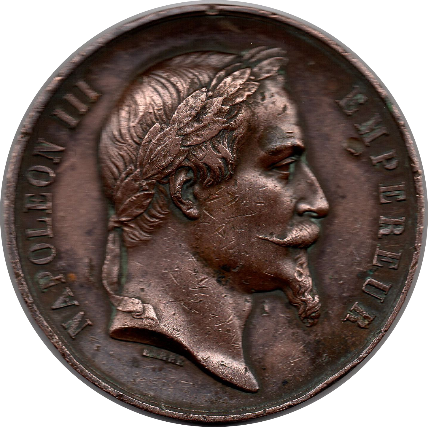 Опис: Профіль Наполеона III, голова в лавровому вінку, борідка та гострі вуса.