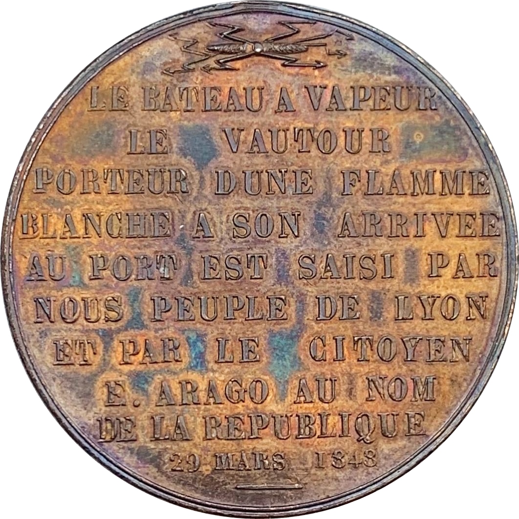 LE BATEAU A VAPEUR LE VAUTOUR PORTEUR DUNE FLAMME BLANCHE A SON ARRIVEE AU PORT EST SAISI PAR NOUS PEUPLE DE LYON ET PAR LE CITOYEN E. ARAGO AU NOM DE LA REPUBLIQUE 29 MARS 1848.