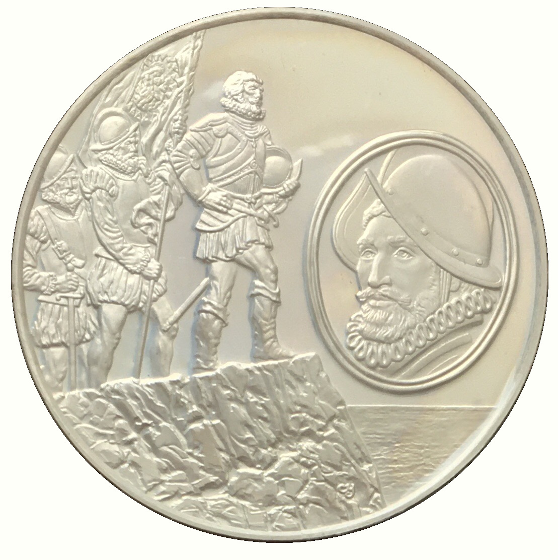 Опис: Медальйон із портретом іспанського конкістадора Васко Нуньєса де Бальбоа. Сцена, в якій Бальбоа та двоє його людей спостерігають за океаном.