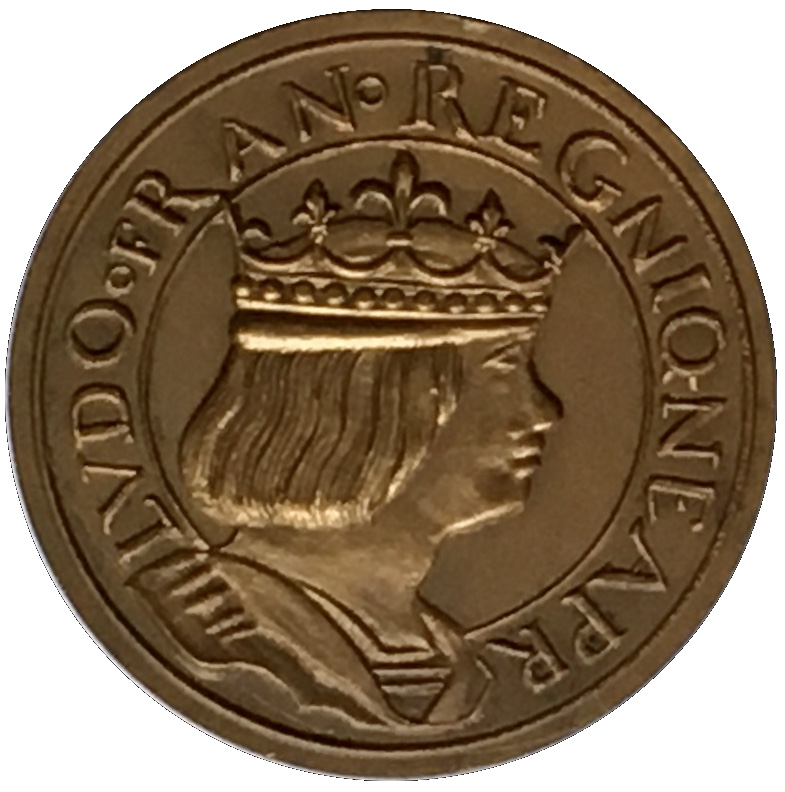 Опис: Репродукція аверсу дуката д'ор де Неаполь Людовика XII (1501-1504): бюст короля Франції Людовика XII в короні, звернений праворуч. Ludovicus Francorum regnique Neapolis rex