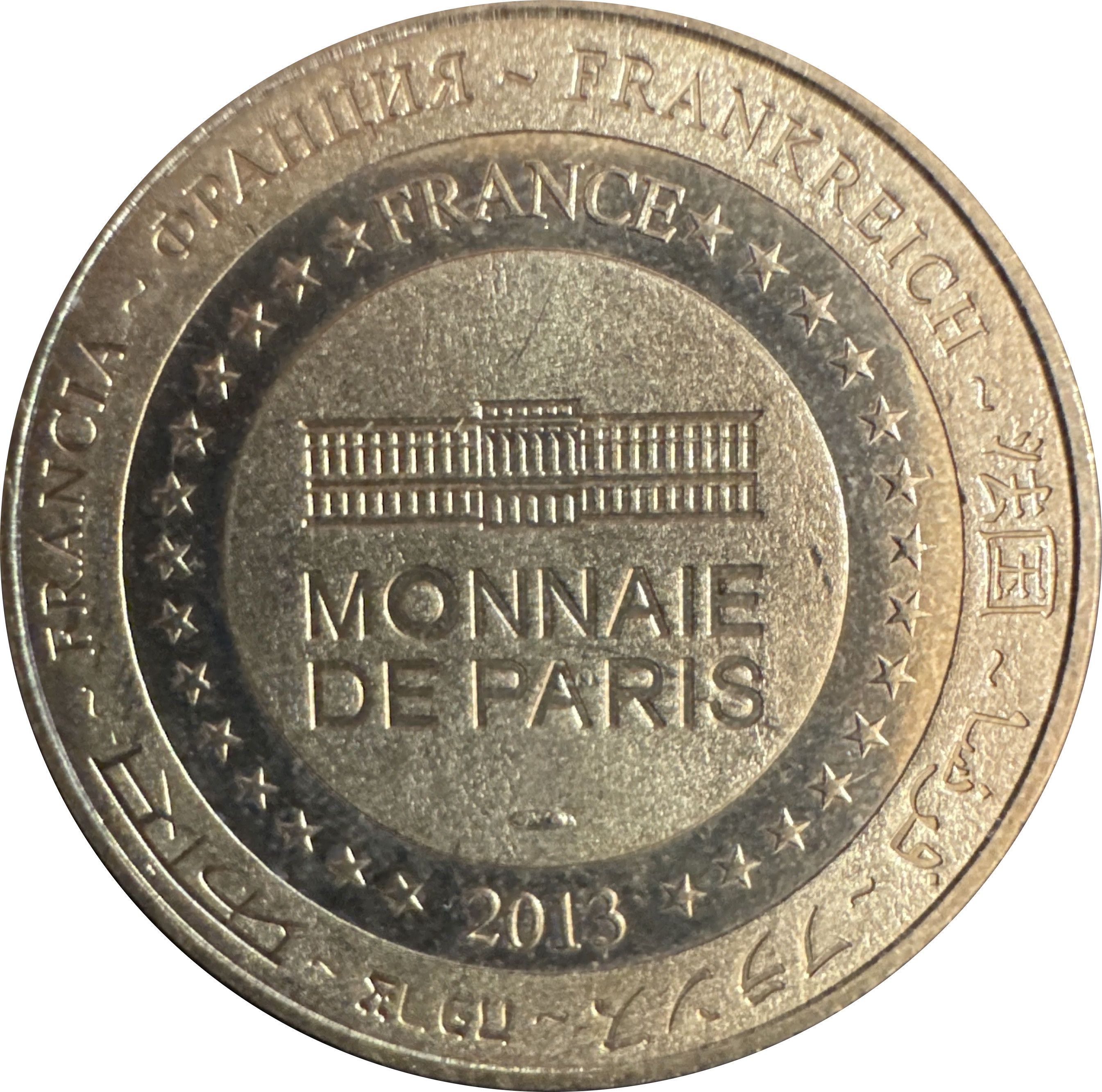 Опис: На периферії слово «Франція» написано вісьмома мовами. Франція на 12-й годині, 2013 рік на 6-й годині, все пов'язане 14 зірками праворуч і ліворуч. У центрі — будівля Монетного двору Парижа.