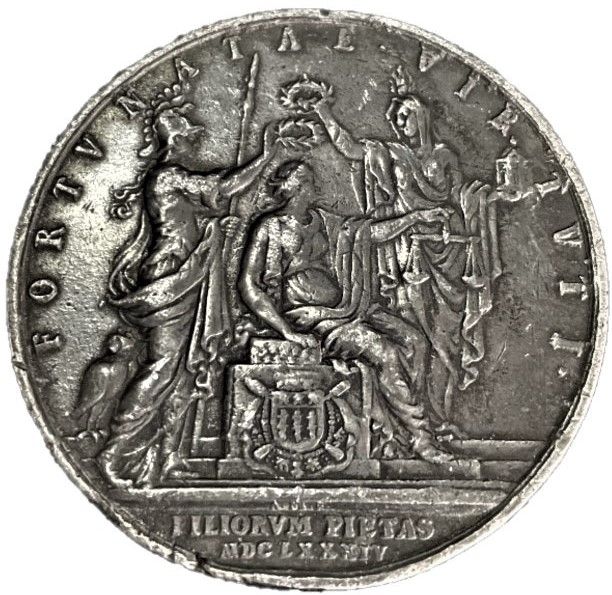 Опис: Алегорія Справедливості, що сидить праворуч, тримаючи в руці ваги, увінчана богинями Мінервою та Істиною, кожна з яких супроводжується різними символами, що їх ідентифікують. Напис навколо та в ексергу з датою. Під терасою, що утворює лінію ексергу, ініціали гравера.