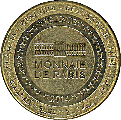 Опис: На периферії слово «Франція» написано вісьмома мовами. Франція на 12-й годині, 2014 рік на 6-й годині, все пов'язане 14 зірками праворуч і ліворуч. У центрі — будівля Моне де Парі.