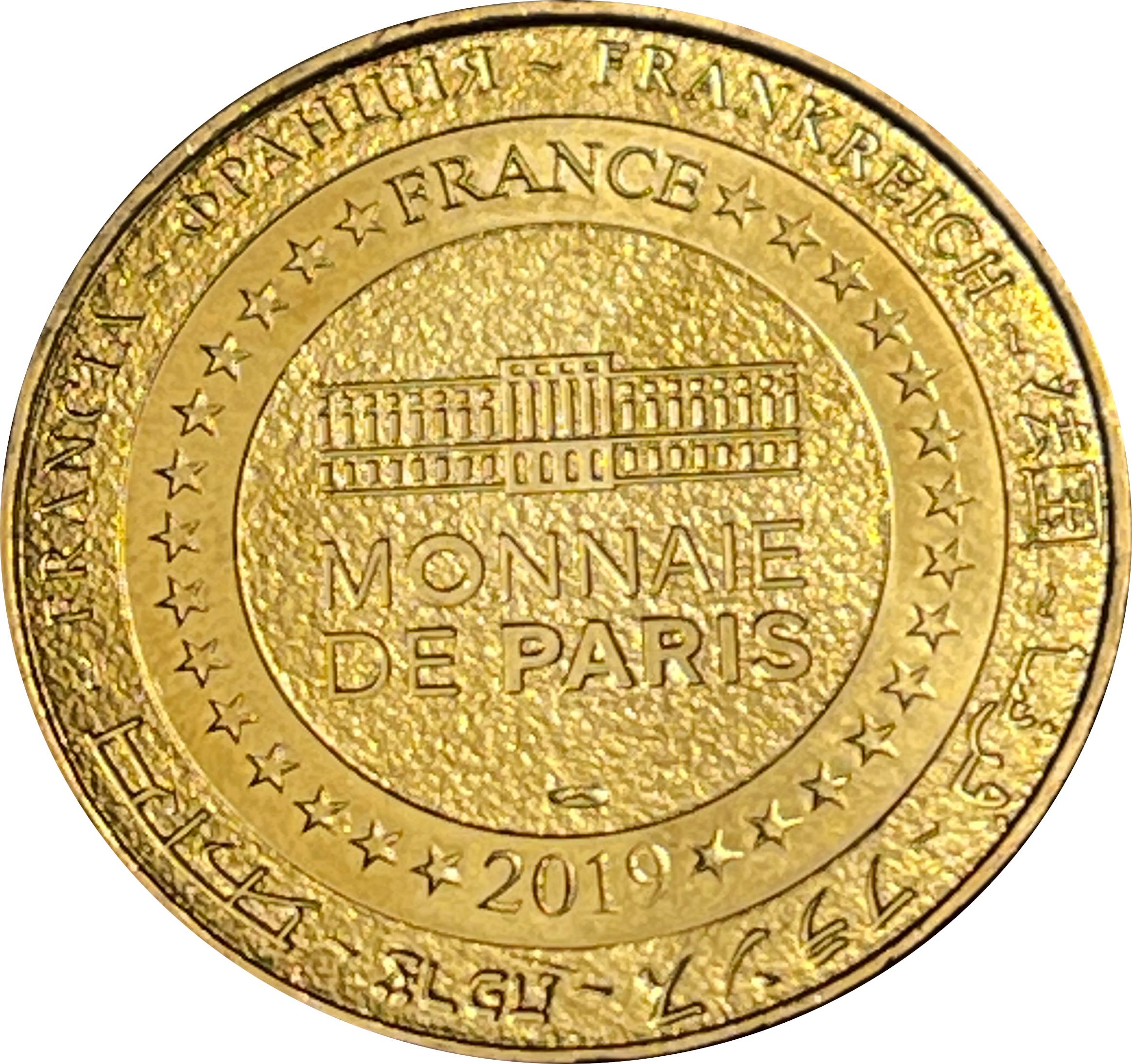 Опис: На периферії слово «Франція» написано вісьмома мовами. Франція на 12-й годині, 2019 рік на 6-й годині, все пов'язане 14 зірками праворуч і ліворуч. У центрі — будівля Монетного двору Парижа.