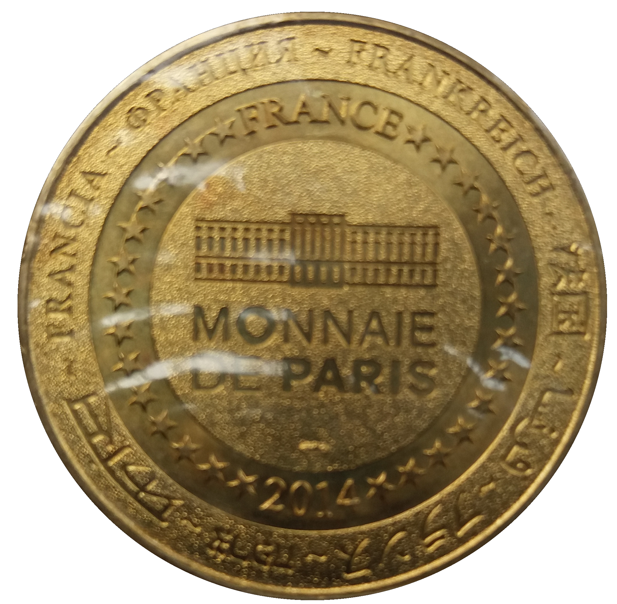 Опис: На периферії слово «Франція» написано вісьмома мовами. Франція на 12-й годині, 2014 рік на 6-й годині, все пов'язане 14 зірками праворуч і ліворуч. У центрі — будівля Моне де Парі.
