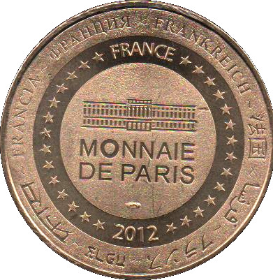 Опис: На периферії слово «Франція» написано вісьмома мовами. Франція на 12-й годині, 2012 рік на 6-й годині, все пов'язане 14 зірками праворуч і ліворуч. У центрі — будівля Монетного двору Парижа.