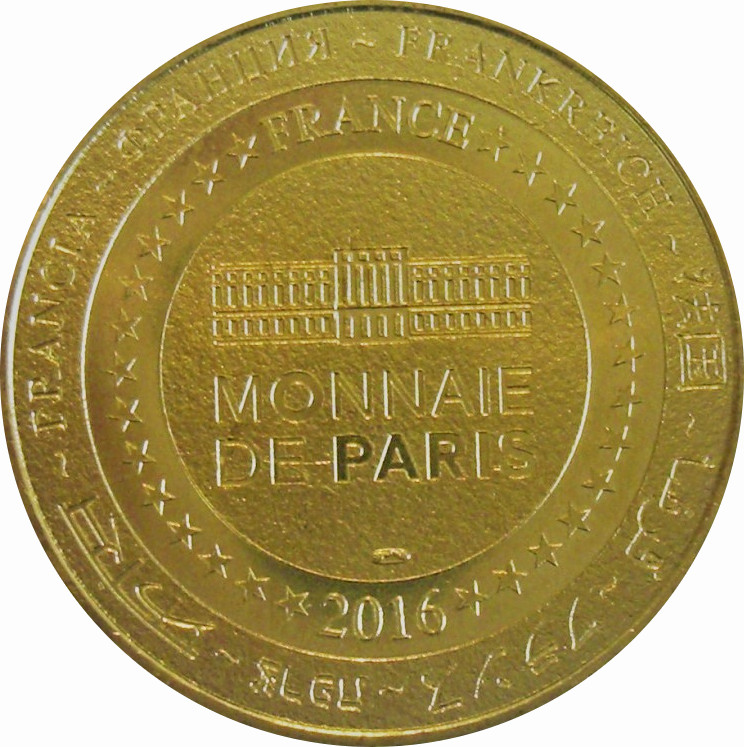 Опис: На периферії слово «Франція» написано вісьмома мовами. Франція на 12-й годині, 2016 рік на 6-й годині, все пов'язано 14 зірками праворуч і ліворуч. У центрі — будівля Моне де Парі.