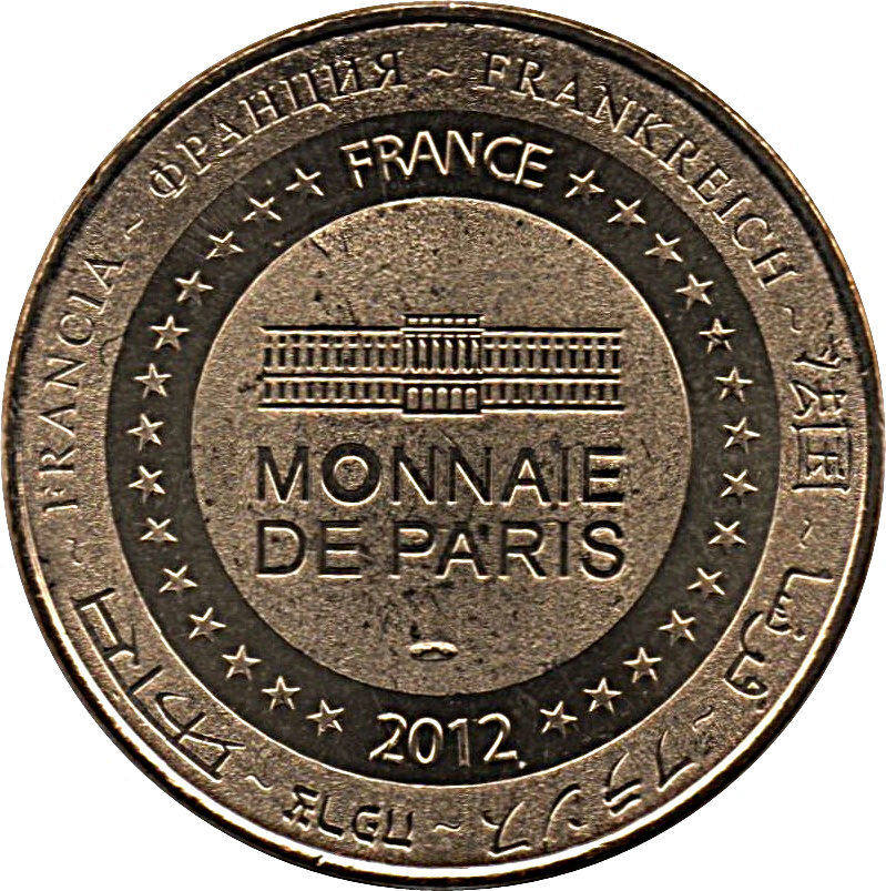 Опис: На периферії слово «Франція» написано вісьмома мовами. Франція на 12-й годині, 2012 рік на 6-й годині, все пов'язане 14 зірками праворуч і ліворуч. У центрі — будівля Монетного двору Парижа.