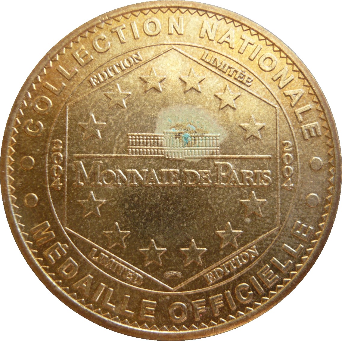 Опис: Текст по периферії. Шестикутник з роком праворуч і ліворуч. У центрі — будівля Monnaie de Paris з 6 зірками зверху і знизу.