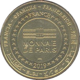 Опис: На периферії слово «Франція» написано вісьмома мовами. Франція на 12-й годині, 2019 рік на 6-й годині, все пов'язане 14 зірками праворуч і ліворуч. У центрі — будівля Моне де Парі.