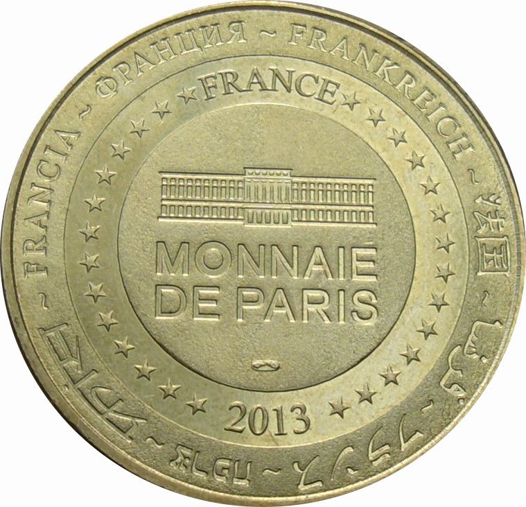 Опис: На периферії слово «Франція» написано вісьмома мовами. Франція на 12-й годині, 2013 рік на 6-й годині, все пов'язане 14 зірками праворуч і ліворуч. У центрі — будівля Монетного двору Парижа.