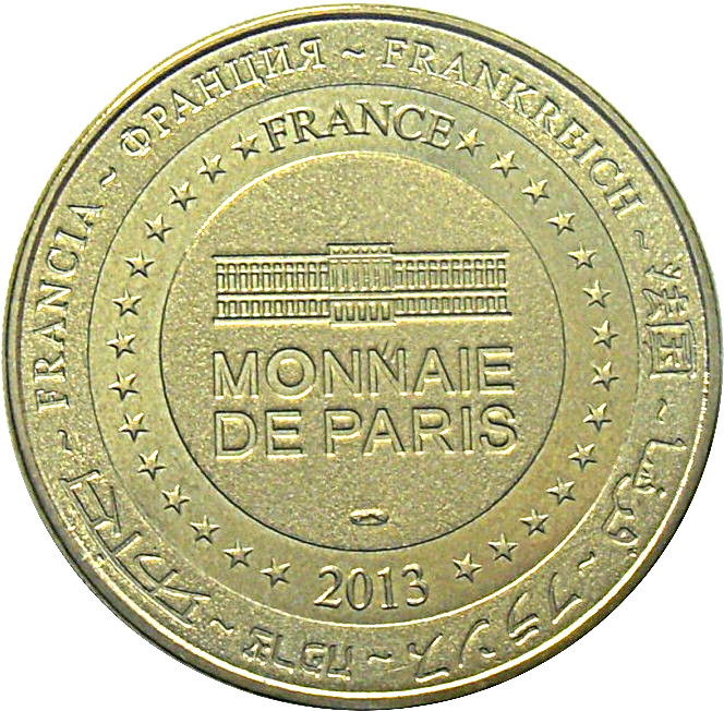 Опис: На периферії слово «Франція» написано вісьмома мовами. Франція на 12-й годині, 2013 рік на 6-й годині, все пов'язано 14 зірками праворуч і ліворуч. У центрі — будівля Моне де Парі.