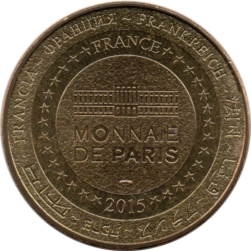 Опис: На периферії слово «Франція» написано вісьмома мовами. Франція на 12-й годині, 2015 рік на 6-й годині, все пов'язане 14 зірками праворуч і ліворуч. У центрі — будівля Monnaie de Paris.