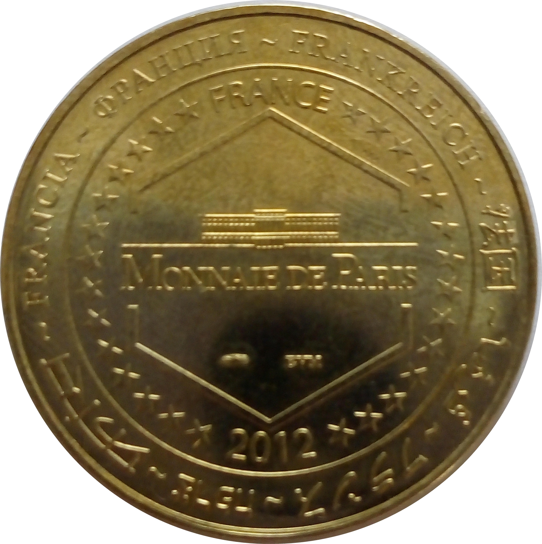 Опис: На периферії слово «Франція» написано вісьмома мовами. Франція на 12-й годині, 2012 рік на 6-й годині, все пов'язано 14 зірками праворуч і ліворуч. У центрі — будівля Monnaie de Paris у шестикутнику.