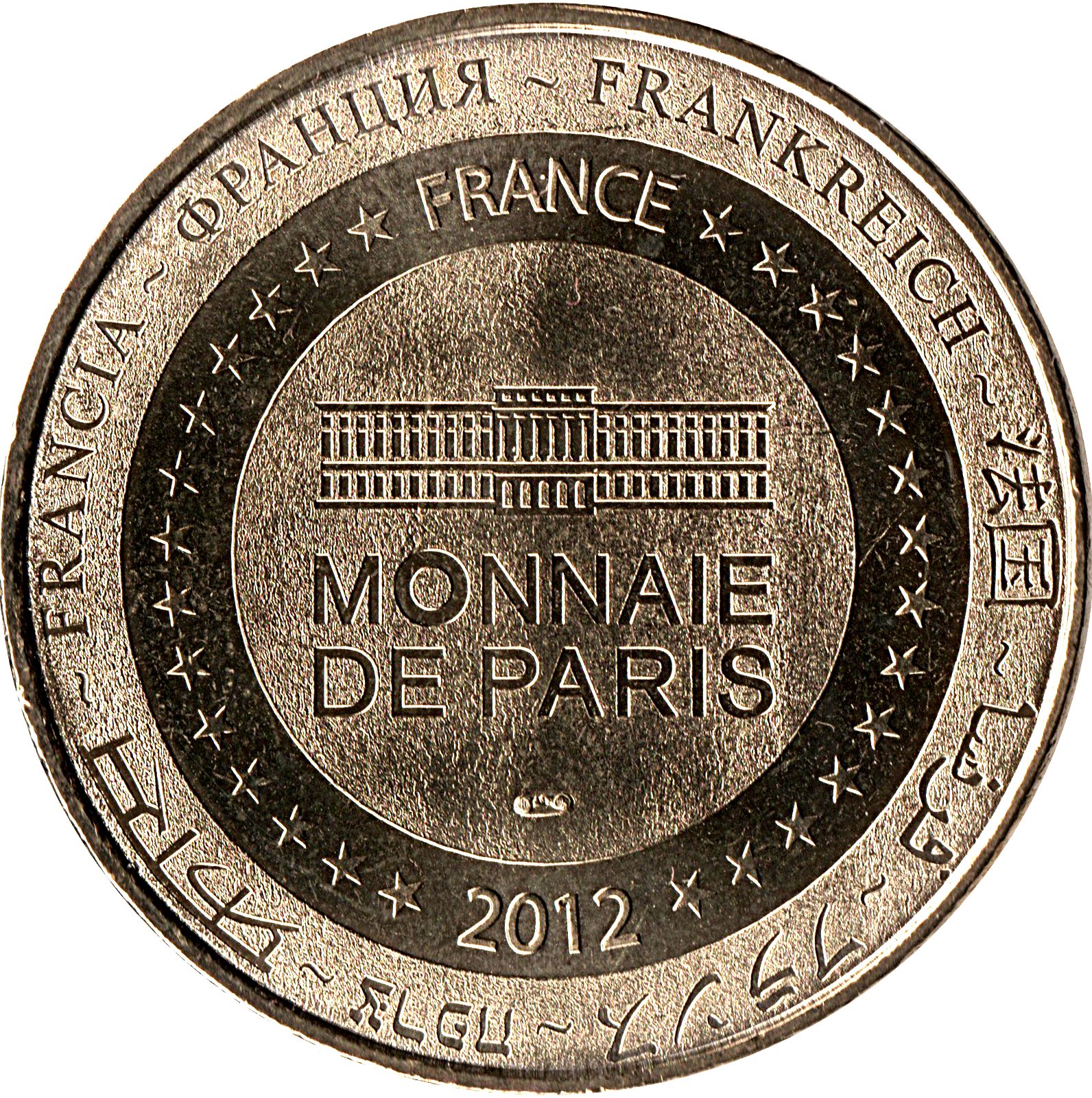 Опис: На периферії слово «Франція» написано вісьмома мовами. Франція на 12-й годині, 2012 рік на 6-й годині, все пов'язане 14 зірками праворуч і ліворуч. У центрі — будівля Монетного двору Парижа.