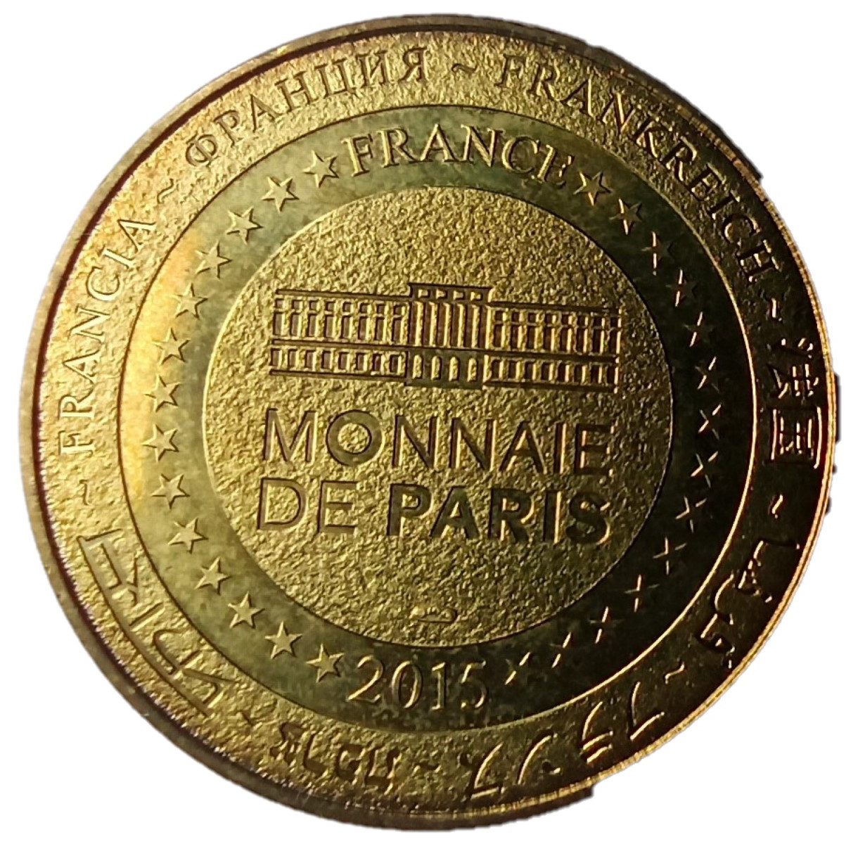 Опис: На периферії слово «Франція» написано вісьмома мовами. Франція на 12-й годині, 2015 рік на 6-й годині, все пов'язане 14 зірками праворуч і ліворуч. У центрі — будівля Моне-де-Парі.