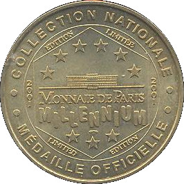 Опис: Текст по периферії. У центрі шестикутника — будівля La Monnaie de Paris, оточена 9 зірками. Дати 3 години та 9 годин.