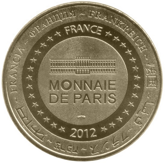 Опис: На периферії слово «Франція» написано вісьмома мовами. Франція на 12-й годині, 2012 рік на 6-й годині, все пов'язане 14 зірками праворуч і ліворуч. У центрі — будівля Монетного двору Парижа.