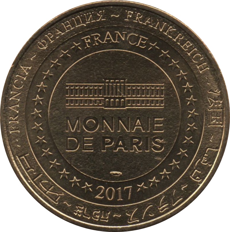 Опис: На периферії слово «Франція» написано вісьмома мовами. Франція на 12-й годині, 2017 рік на 6-й годині, все пов'язане 14 зірками праворуч і ліворуч. У центрі — будівля Монетного двору Парижа.