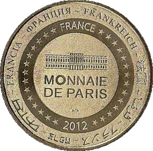 Опис: На периферії слово «Франція» написано вісьмома мовами. Франція на 12-й годині, 2012 рік на 6-й годині, все пов'язане 14 зірками праворуч і ліворуч. У центрі — будівля Монетного двору Парижа.