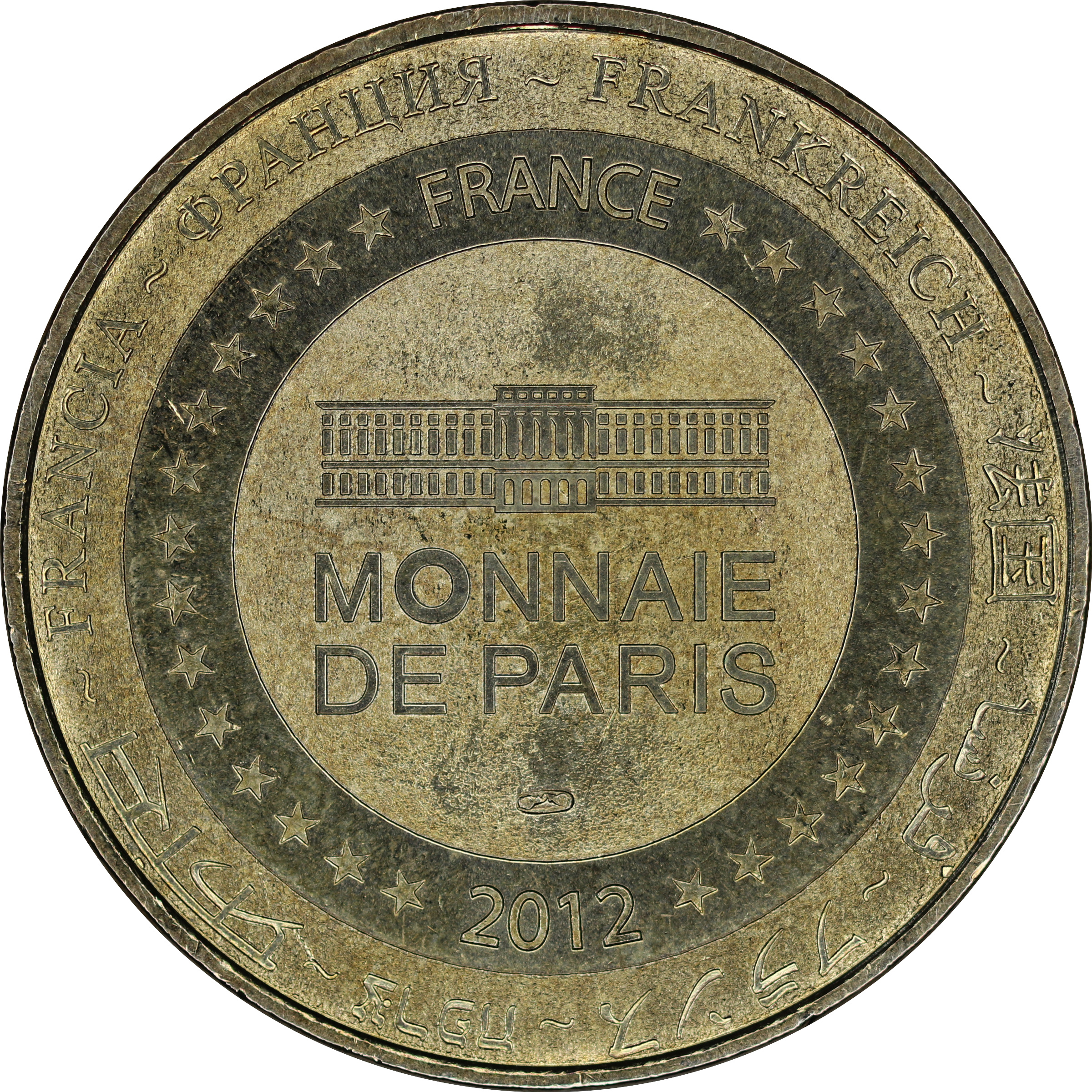 Опис: На периферії слово «Франція» написано вісьмома мовами. Франція на 12-й годині, 2012 рік на 6-й годині, все пов'язане 14 зірками праворуч і ліворуч. У центрі — будівля Монетного двору Парижа.