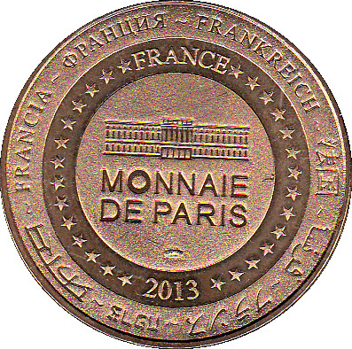 Опис: На периферії слово «Франція» написано вісьмома мовами. Франція на 12-й годині, 2013 рік на 6-й годині, все пов'язано 14 зірками праворуч і ліворуч. У центрі — будівля монетного двору в Парижі.