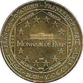 Опис: На периферії слово «Франція» написано вісьмома мовами. Франція на верхній і нижній сторонах шестикутника, рік праворуч і ліворуч. У центрі — будівля Monnaie de Paris з 6 зірками зверху і знизу.
