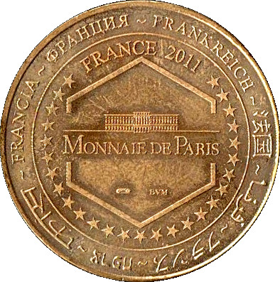 Опис: Центральне зображення оточене словами «Франція» багатьма мовами.